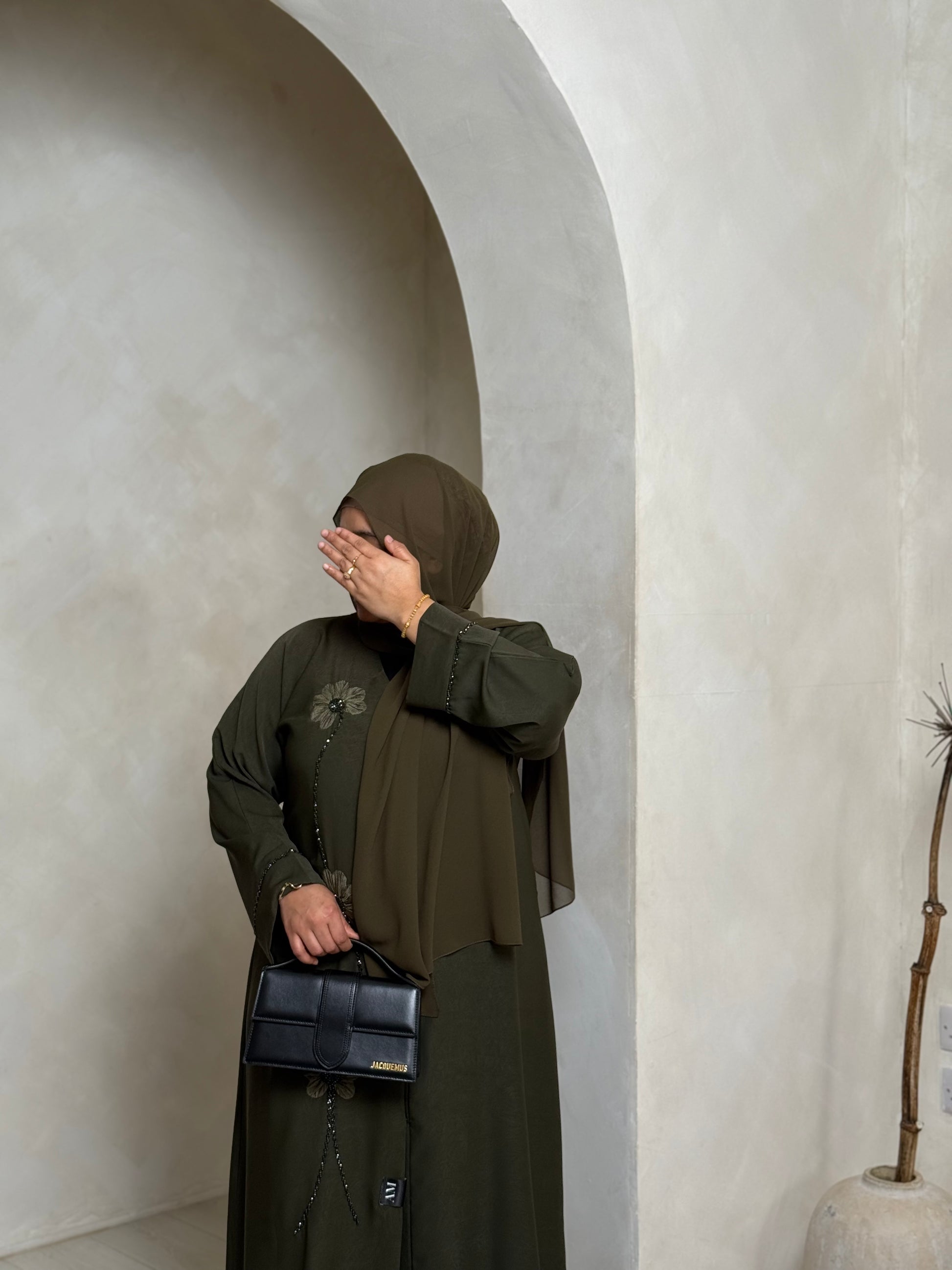 - Abaya comes in 2 piece set (Open embellished abaya with buttons, chiffon headscarf)